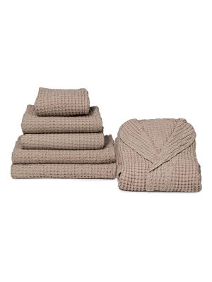 | TIPOLOGIA: | 1 telo bagno mis. 100X150, 2 salviette viso mis. 60X110, 2 ospiti mis 40X60, 10 Lavette spugna mis.30×30, Tappeto bagno reversibile mis 70×120 |