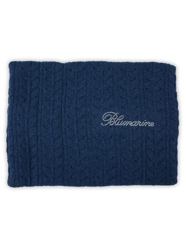 Copertina per culla e carrozzina con disegno in jacquard punzonato e logo in cristalli. Misura: 95X110. Tessuto: 80% lana, 20% poliamnide. Colore: Blu