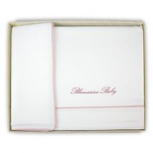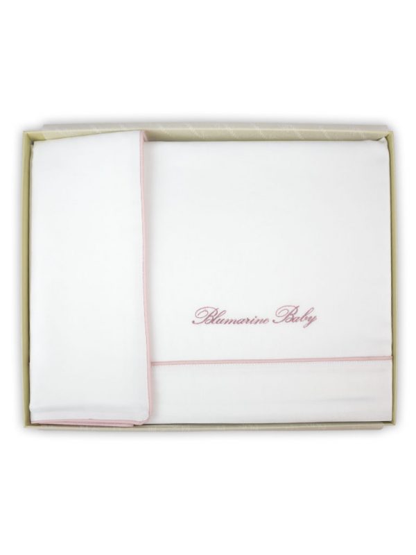 Completo lenzuola per lettino in 100% raso di cotone con profilo a contrasto e logo ricamato. Lenzuolo sopra 120×180 con profilo inserito e logo ricamato, lenzuolo sotot 70×140 con angoli e federa 60×40 a 2 volani