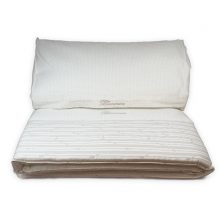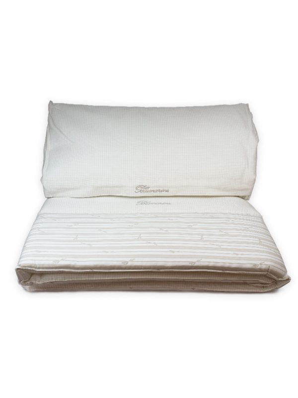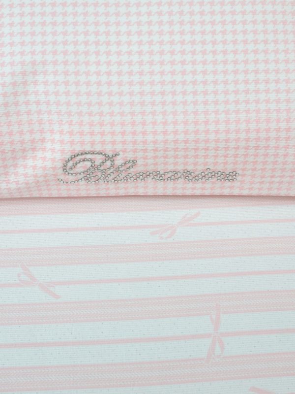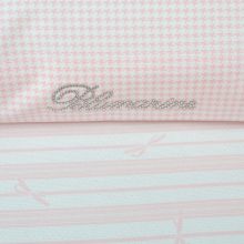Sacca lettino in 100% cotone. Set a 5 pezzi: paracolpi costruito in pied de poul stampato e logo in cristalli, sacca 120×150 stampata a righe e logo in cristalli, interno estraibile imbottito 70×120 da 320gr/mq, federa 60×40 a 2 volani stampata e lenzuolo sotto 70×140 in percalle tinta unita