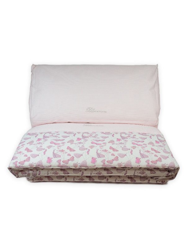 Sacca lettino in 100% percalle di cotone. Set a 5 pezzi: paracolpi in percalle stampato e logo in cristalli, sacca 120×150 stampata e logo in cristalli, interno estraibile imbottito 70×120 da 320gr/mq, federa 60×40 a 2 volani stampata e lenzuolo sotto in percalle tinta unita 70×140 con angoli. Colore: Cipria