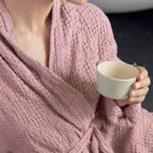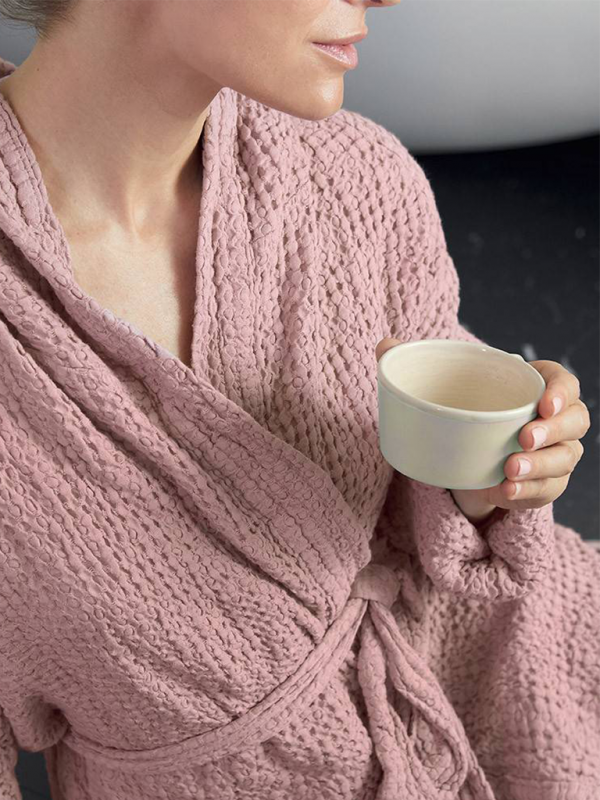 Accappatoio con cappuccio in nido d’ape di puro cotone organico, tinto in filo.