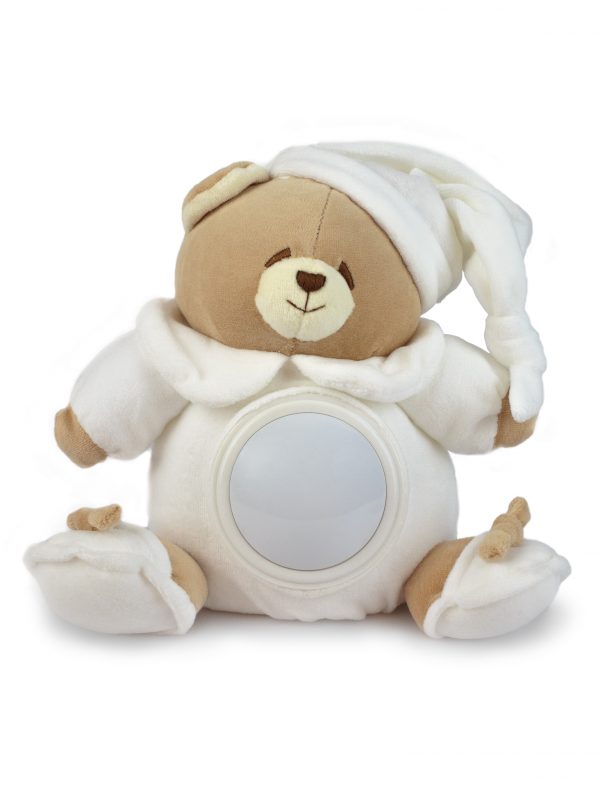 Peluche a forma di orsetto, completamente rivestito in puro cotone al 100%. Sulla pancia si trova un interruttore rotondo, che una volta toccato, emette una luce tenue. Dimensioni: 25cm