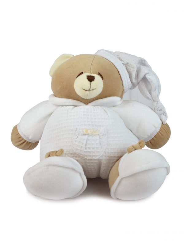 Peluche dell’orsetto Tato in puro cotone al 100%. Vestito in tessuto piquet, con il musetto, le mani e i piedi in ciniglia
