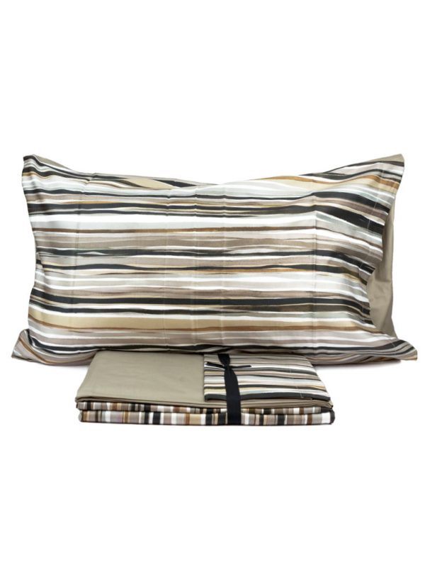 Il completo letto in 100% raso di cotone con applicazione di stampa digitale mentre il retro delle due federe e il lenzuolo sotto con angoli sono 100% percalle.