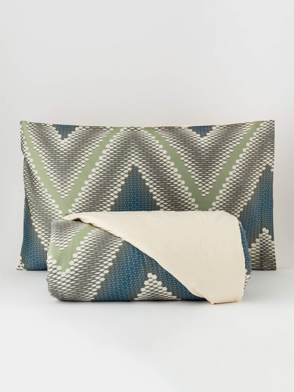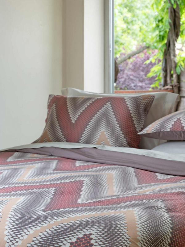 Parure copripiumino è in 100% raso di cotone con applicazione di stampa digitale mentre le due federe coordinate sono 100% percalle. La parure è a sacco di 250×200 cm + pattella di 40cm