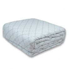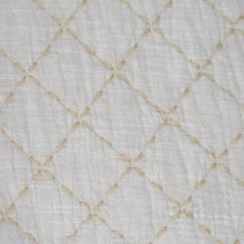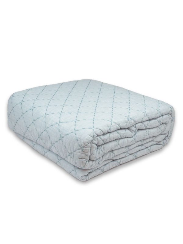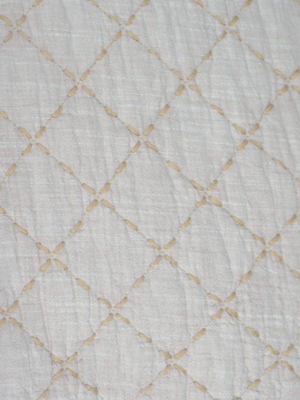 Trapuntino in lino e cotone effetto vintage con impuntatura e contrasto. Fronte 15% lino, 85% cotone. Retro 100% cotone. Imbottitura 50% cotone, 50% poliestere. Misura: 260×260