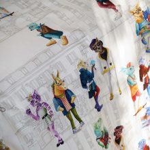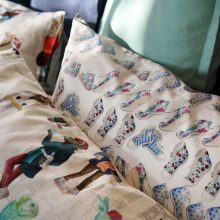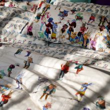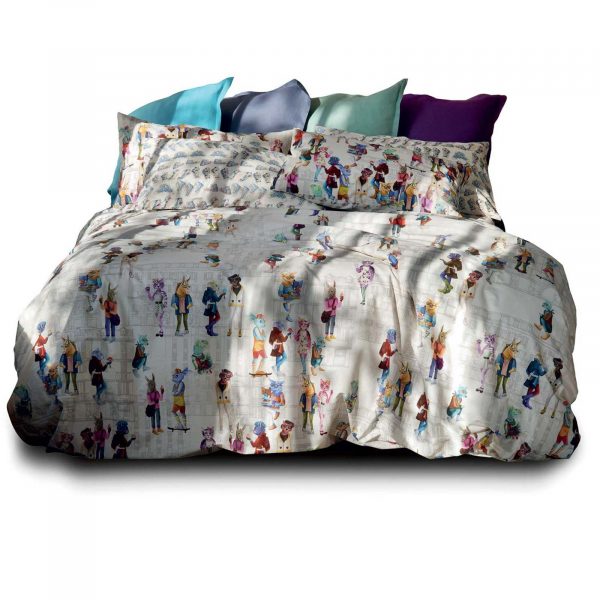 Set completo lenzuola singolo. Lenzuolo sopra stampato con balza staccata a cm.60 e riattaccata a rovescio. Lenzuolo sotto tinta unita naturale, federa a sacchetto stampata. Misura: 160×290. Composizione: 100% cotone. Colore: Naturale